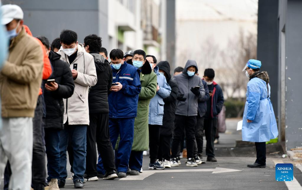 Citizens line up for nucleic acid test at a testing site in Binhai New Area in north China's Tianjin, Jan. 9, 2022. North China's Tianjin, a municipality that neighbors Beijing, has decided to start a citywide nucleic acid testing after 20 people tested positive for COVID-19, authorities said Sunday. The infections were reported from 6 p.m. Friday to 9 p.m. Saturday in Jinnan District, and the gene sequencing found the first two locally transmitted confirmed cases were infected with the VOC/Omicron variant, according to the municipal headquarters for COVID-19 prevention and control. (Xinhua/Zhao Zishuo)