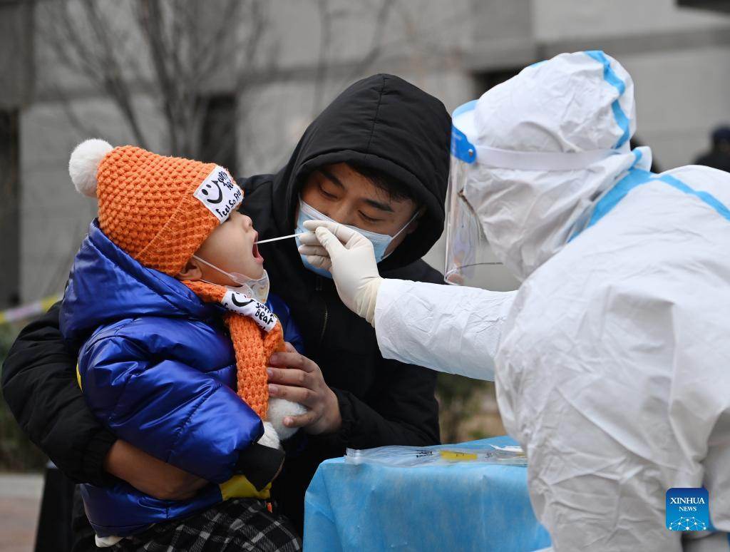 A parent holds a child for nucleic acid test at a testing site of a residential area in Xiqing District in north China's Tianjin, Jan. 9, 2022. North China's Tianjin, a municipality that neighbors Beijing, has decided to start a citywide nucleic acid testing after 20 people tested positive for COVID-19, authorities said Sunday. The infections were reported from 6 p.m. Friday to 9 p.m. Saturday in Jinnan District, and the gene sequencing found the first two locally transmitted confirmed cases were infected with the VOC/Omicron variant, according to the municipal headquarters for COVID-19 prevention and control. (Xinhua/Li Ran)