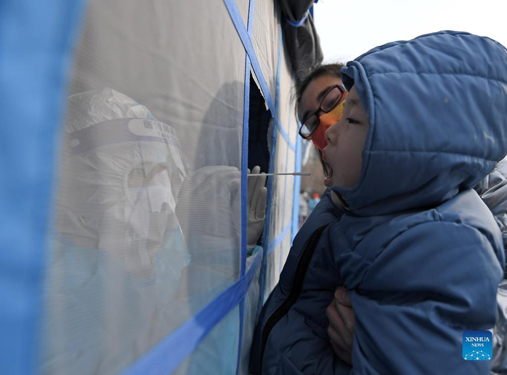 A medical worker takes a swab sample from a child, accompanied by a parent, for nucleic acid test at a testing site of Binhai New Area in north China's Tianjin, Jan. 9, 2022. North China's Tianjin, a municipality that neighbors Beijing, has decided to start a citywide nucleic acid testing after 20 people tested positive for COVID-19, authorities said Sunday. The infections were reported from 6 p.m. Friday to 9 p.m. Saturday in Jinnan District, and the gene sequencing found the first two locally transmitted confirmed cases were infected with the VOC/Omicron variant, according to the municipal headquarters for COVID-19 prevention and control. (Xinhua/Zhao Zishuo)