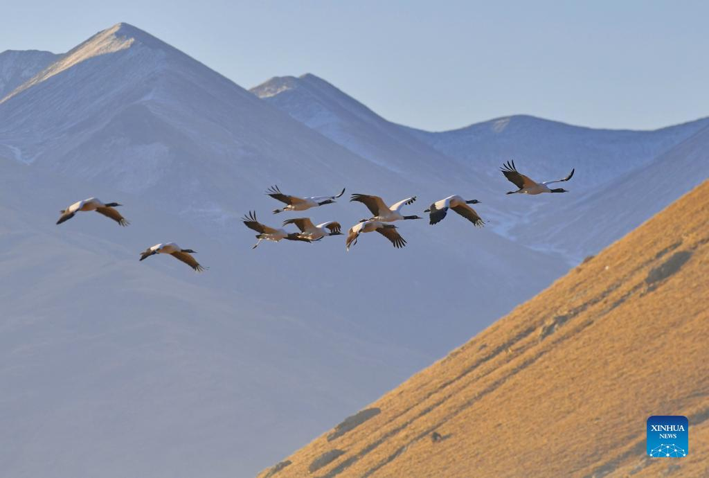 Black-necked cranes fly in Lhunzhub County of Lhasa, southwest China's Tibet Autonomous Region, Jan. 9, 2022. The population of black-necked crane is estimated to reach nearly 10,000 in Tibet, according to the regional department of ecology and environment. (Xinhua/Zhang Rufeng)