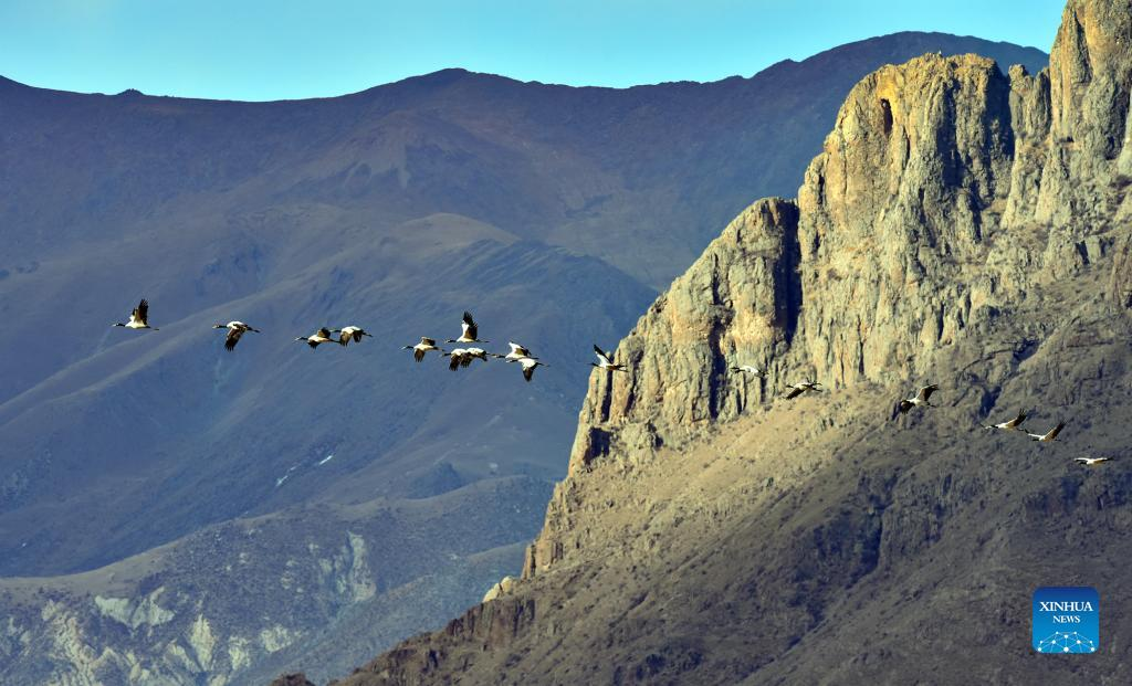 Black-necked cranes fly in Lhunzhub County of Lhasa, southwest China's Tibet Autonomous Region, Jan. 8, 2022. The population of black-necked crane is estimated to reach nearly 10,000 in Tibet, according to the regional department of ecology and environment. (Xinhua/Huang Huo)
