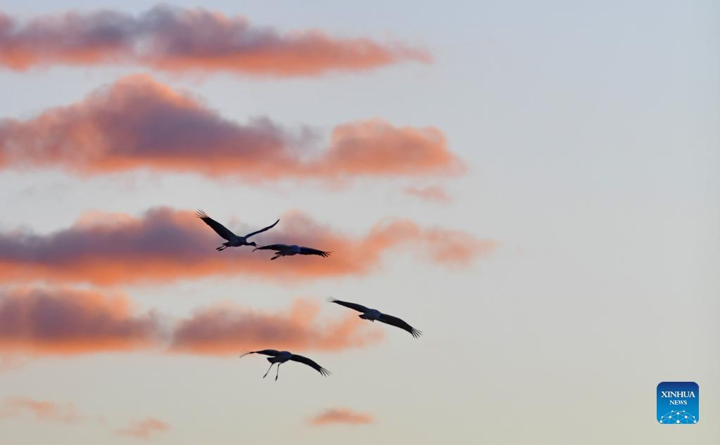 Black-necked cranes fly in Lhunzhub County of Lhasa, southwest China's Tibet Autonomous Region, Jan. 9, 2022. The population of black-necked crane is estimated to reach nearly 10,000 in Tibet, according to the regional department of ecology and environment. (Xinhua/Zhang Rufeng)