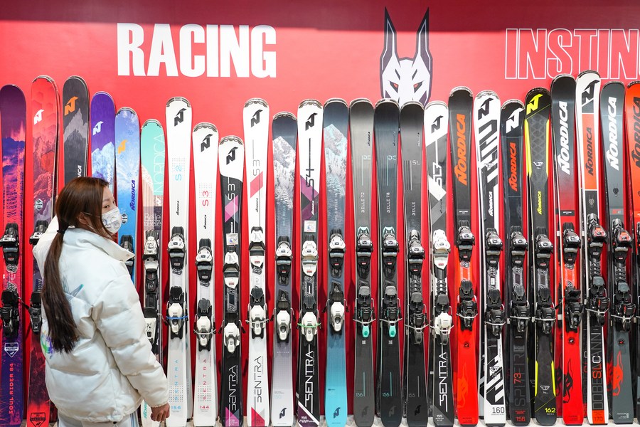 A staff member arranges skis at sports brand Nordica store in Beijing, capital of China, Jan. 6, 2022. (Xinhua/Chen Zhonghao)