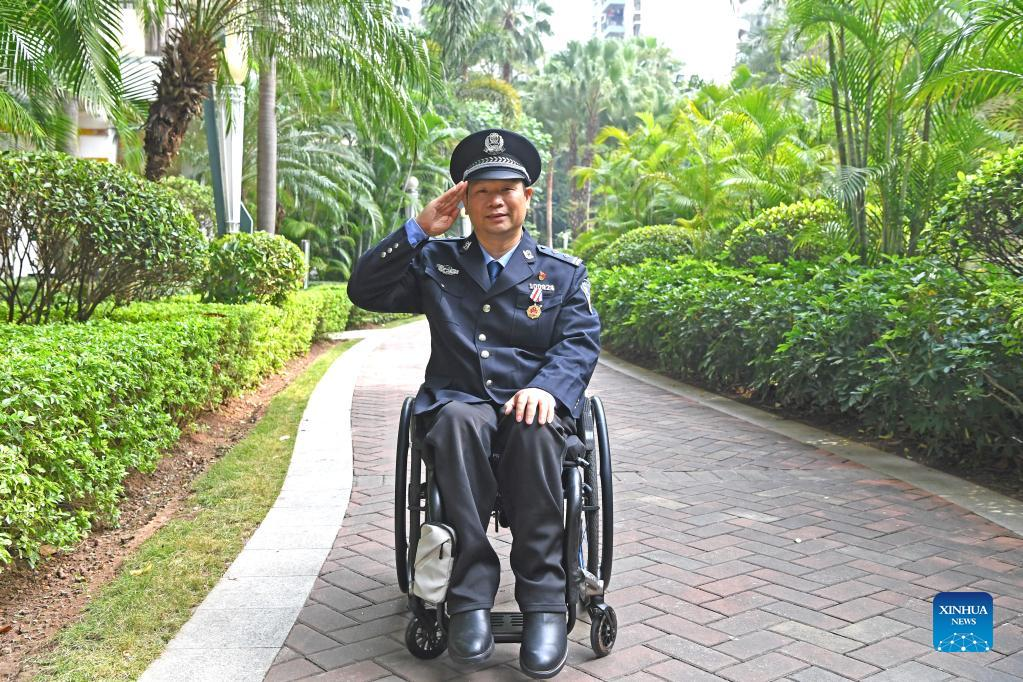 Photo taken on Jan. 6, 2022 shows Tan Jianyong saluting in Nanning, south China's Guangxi Zhuang Autonomous Region. Tan Jianyong is a 49-year-old policeman in Nanning. In 1998, three years after he became a policeman, Tan was shot in the chest by a gunman and got paralyzed from the chest down. Encouraged by his family, colleagues and friends, Tan was pulled out of the mire of depression. He gradually regained the self-care ability and returned to his post with supporting policies from work. Apart from work, Tan also involved himself in community, as he is willing to help disabled people alike mired in depression. (Xinhua/Zhou Hua)