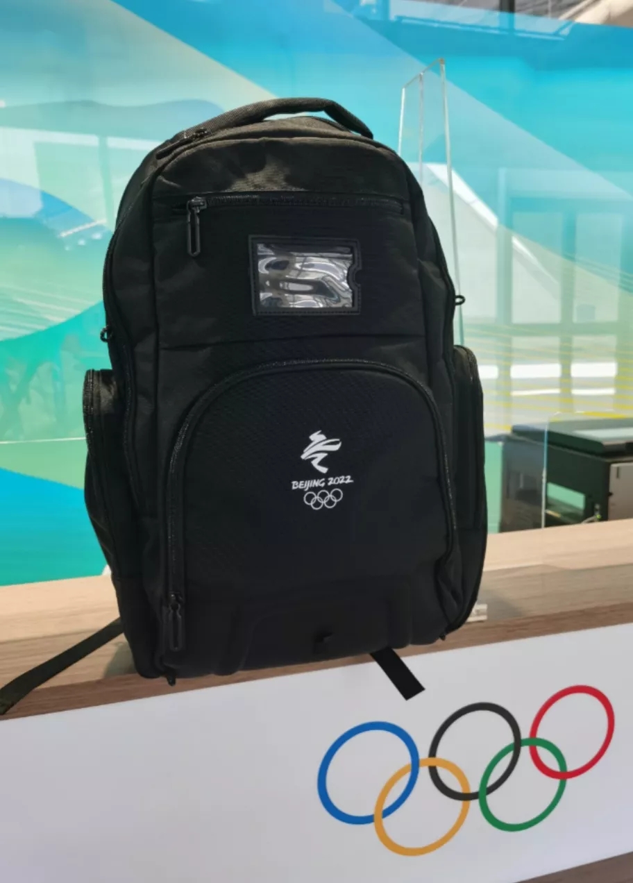 Foreign media workers carry backpacks received at Beijing 2008 all the way to Beijing 2022 Winter Olympic Games