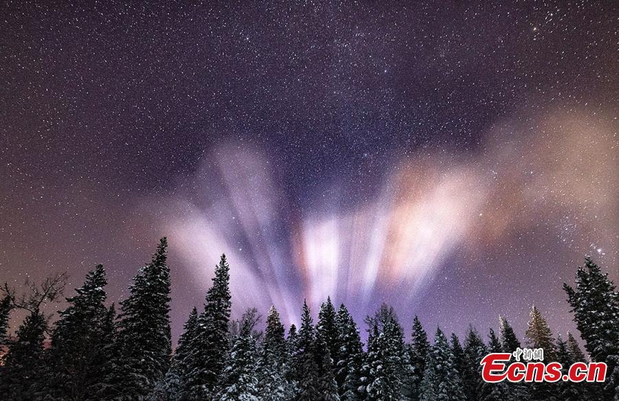 Photo shows the colored light pillars in Kanas scenic area of Altay, northwest China's Xinjiang Uyghur Autonomous Region. (Photo: China News Service/Cai Shi)