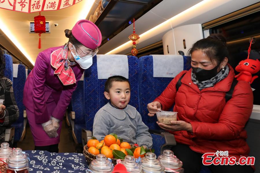 Train attendants on Fuxing EMU (C5980) distribute Laba Congee in Bijie City, Guizhou Province, January 9, 2022. (Photo: China News Service/Qu Honglun)