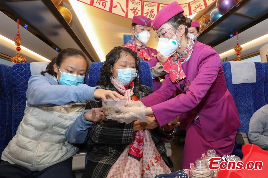 Train attendants on Fuxing EMU (C5980) distribute Laba Congee in Bijie City, Guizhou Province, January 9, 2022. (Photo: China News Service/Qu Honglun)