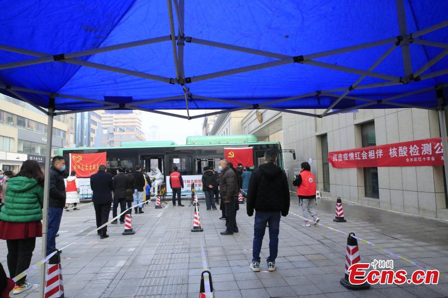 Local residents queue for throat swab COVID tests in front of the bus on Jan. 9, 2022. (Photo: China News Service/Zhu Manjie)