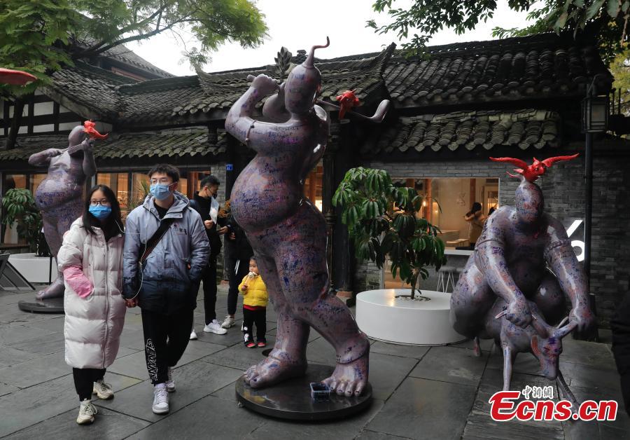 Photo taken on January 9, 2022 shows sculptures of rap pottery figurines in Kuanzhai Alley, Chengdu City, southwest China's Sichuan Province. (Photo: China News Service/Wang Lei)