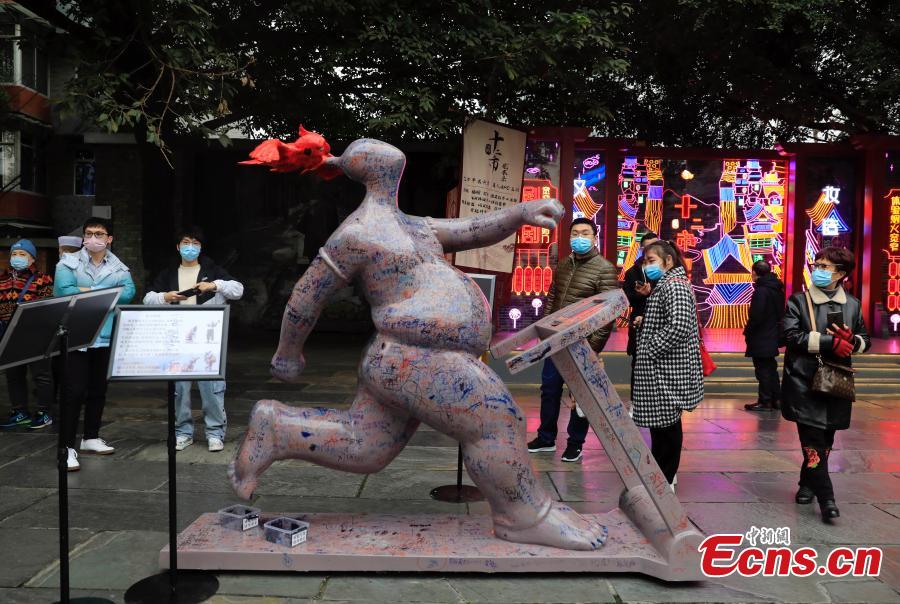 Photo taken on January 9, 2022 shows a sculpture of a rap pottery figurine in Kuanzhai Alley, Chengdu City, southwest China's Sichuan Province. (Photo: China News Service/Wang Lei)