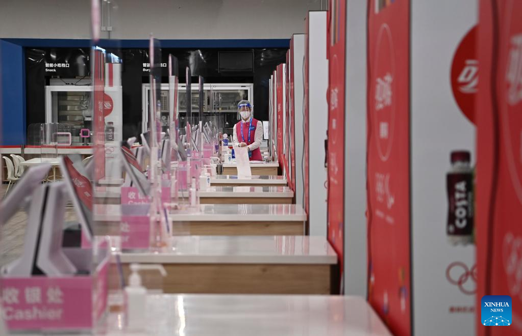 A staff sorts out a cashier at the Media Dining Hall of the Main Media Center for the 2022 Olympic and Paralympic Winter Games in Beijing, capital of China, Jan. 10, 2022. (Xinhua/He Changshan)