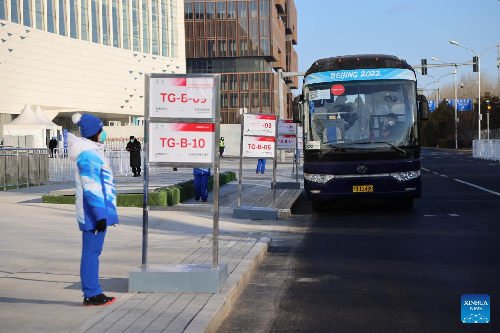 Photo taken on Jan. 10, 2022 shows the TM Bus Load Zone in front of the Main Media Center for the 2022 Olympic and Paralympic Winter Games in Beijing, capital of China. (Xinhua/Xu Zijian)