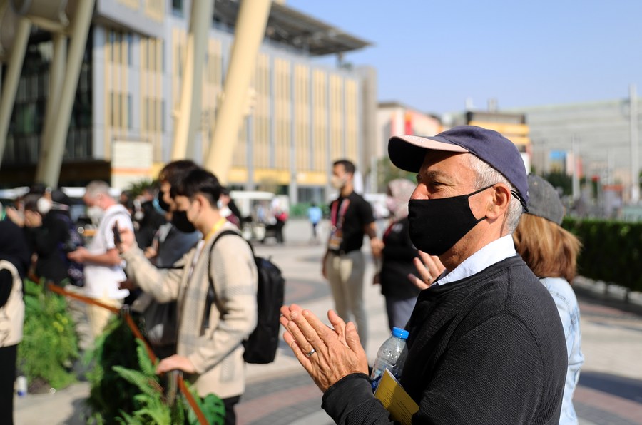Tourists applaud for the opening ceremony performance of the National Day of China Pavilion at Expo 2020 Dubai in Dubai, the United Arab Emirates, on Jan 10, 2022. (Xinhua/Wang Dongzhen)