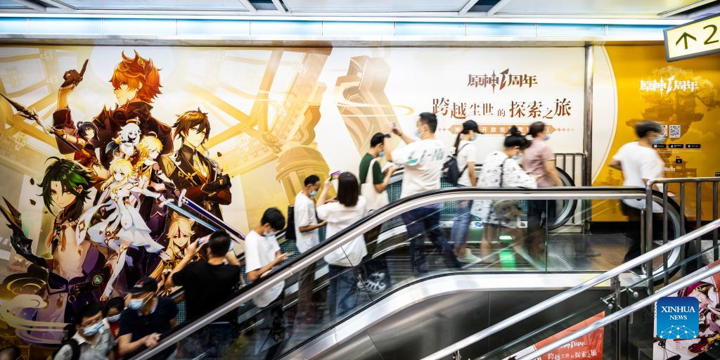 Photo taken on Sept. 17, 2021 shows a poster of the Chinese-made game Genshin Impact in a subway station in Shenzhen, south China's Guangdong Province. (Xinhua)