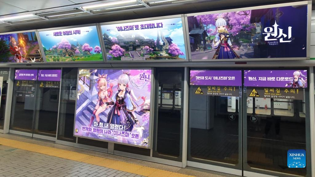 This undated photo shows posters of the Chinese-made game Genshin Impact in a subway station in South Korea. (MiHoYo Company/Handout via Xinhua)