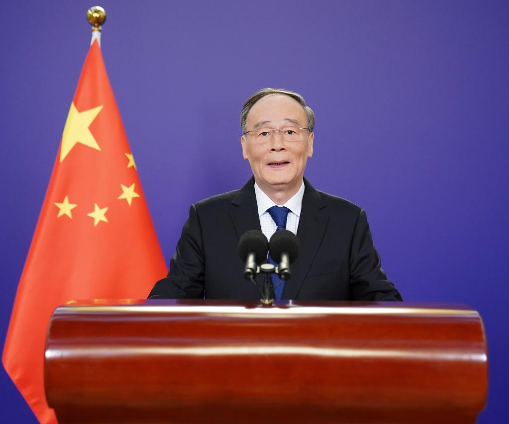 Chinese Vice President Wang Qishan delivers a speech at the 2nd Dialogue on Exchanges and Mutual Learning among Civilizations via video, Jan. 10, 2022. (Xinhua/Yan Yan)