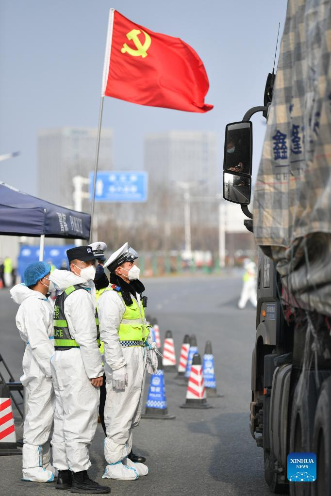 Policemen in protective gears are on duty at a tollgate in Xi'an, capital of northwest China's Shaanxi Province, Jan. 10, 2022. Monday marks the second Chinese People's Police Day. It falls every Jan. 10, corresponding with the country's emergency call number of 110. Policemen in Xi'an stick to their posts on the day to secure the COVID-19 epidemic prevention and control. (Xinhua/Zhang Bowen)