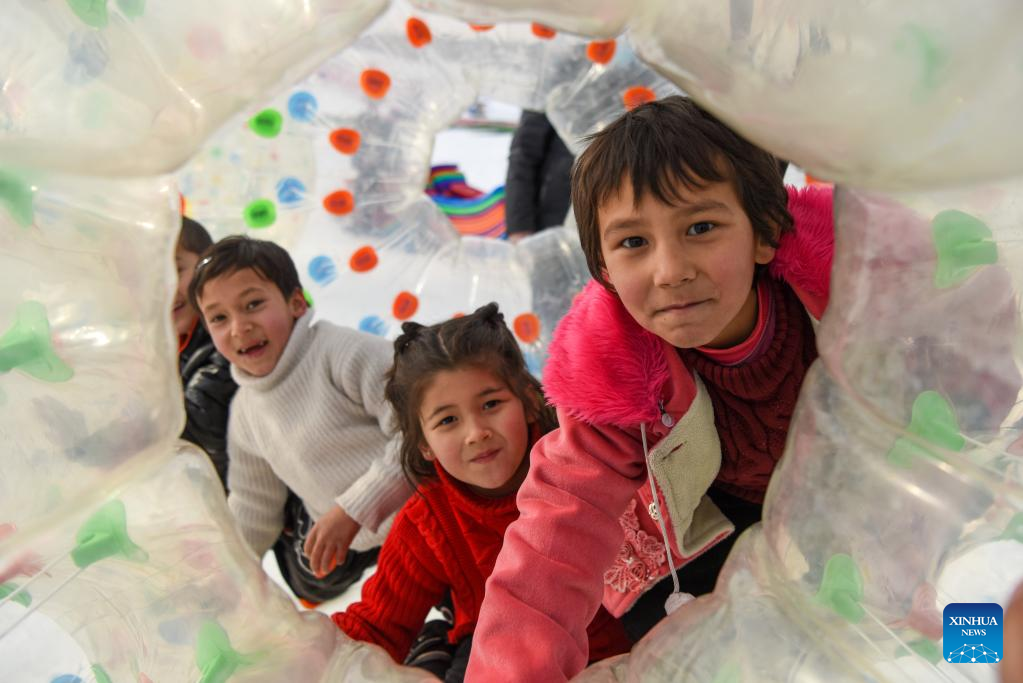 Children have fun at Oynak ski resort in Moyu County, northwest China's Xinjiang Uygur Autonomous Region, Jan. 9, 2022. Located on the southern brim of the Taklimakan Desert, Moyu County barely snows in winter. In order to boost its winter tourism and extend the tourism season, the county built Oynak ski resort by making artificial snow, fueling people's passion for winter sports here. (Xinhua/Ding Lei)