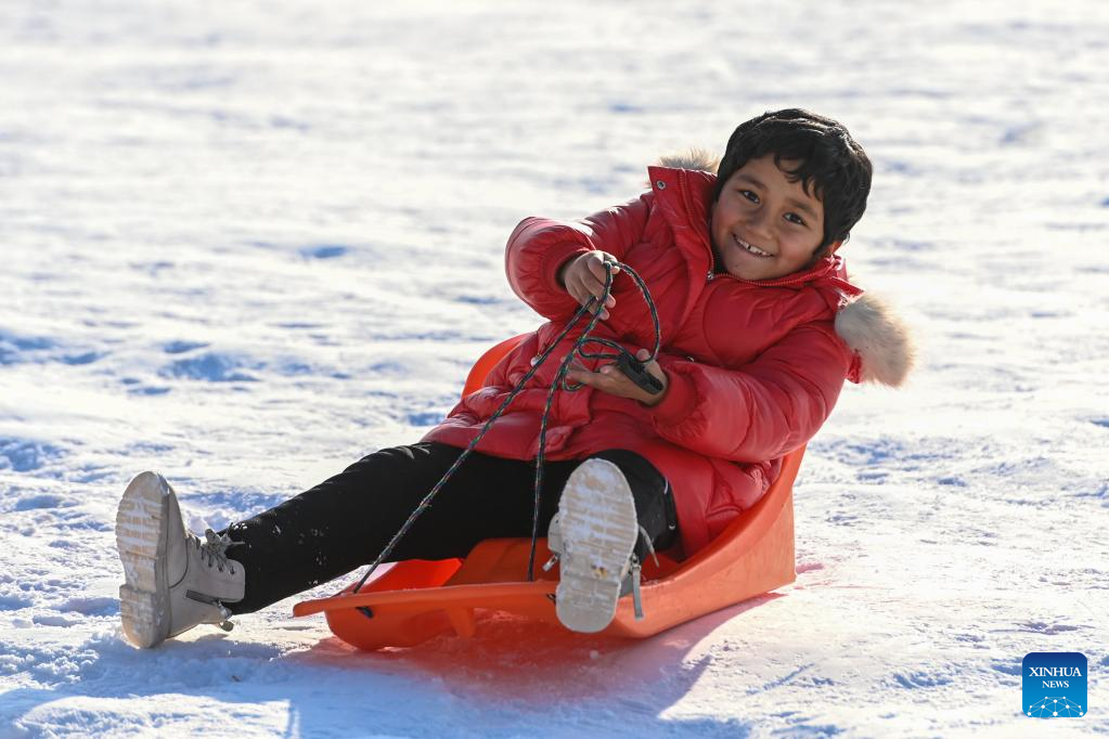 A child has fun at Oynak ski resort in Moyu County, northwest China's Xinjiang Uygur Autonomous Region, Jan. 9, 2022. Located on the southern brim of the Taklimakan Desert, Moyu County barely snows in winter. In order to boost its winter tourism and extend the tourism season, the county built Oynak ski resort by making artificial snow, fueling people's passion for winter sports here. (Xinhua/Ding Lei)