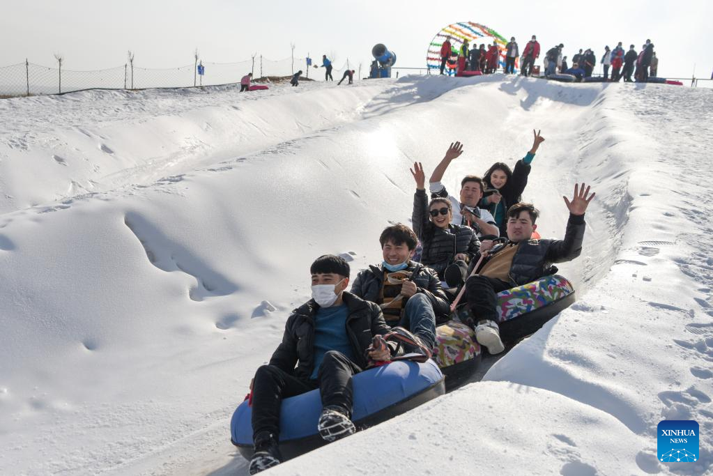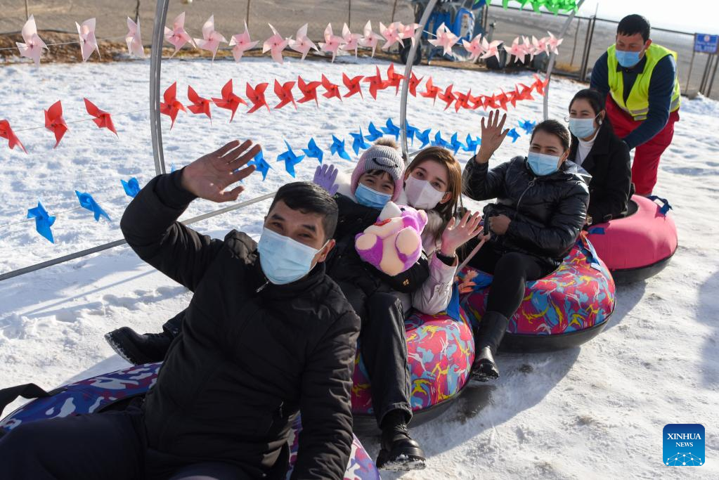 Tourists play on snow tubes at Oynak ski resort in Moyu County, northwest China's Xinjiang Uygur Autonomous Region, Jan. 9, 2022. Located on the southern brim of the Taklimakan Desert, Moyu County barely snows in winter. In order to boost its winter tourism and extend the tourism season, the county built Oynak ski resort by making artificial snow, fueling people's passion for winter sports here. (Xinhua/Ding Lei)