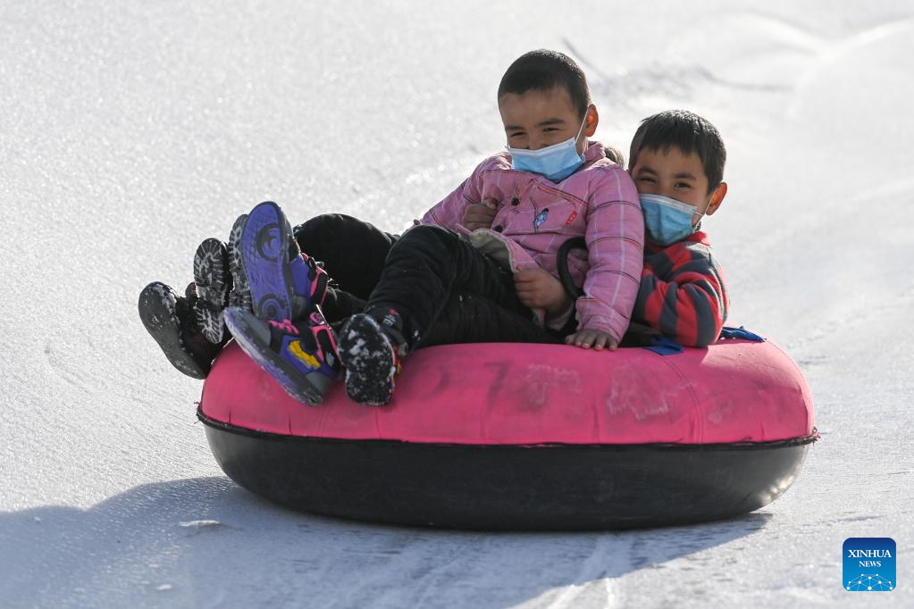 Children play on a snow tube at Oynak ski resort in Moyu County, northwest China's Xinjiang Uygur Autonomous Region, Jan. 9, 2022. Located on the southern brim of the Taklimakan Desert, Moyu County barely snows in winter. In order to boost its winter tourism and extend the tourism season, the county built Oynak ski resort by making artificial snow, fueling people's passion for winter sports here. (Xinhua/Ding Lei)