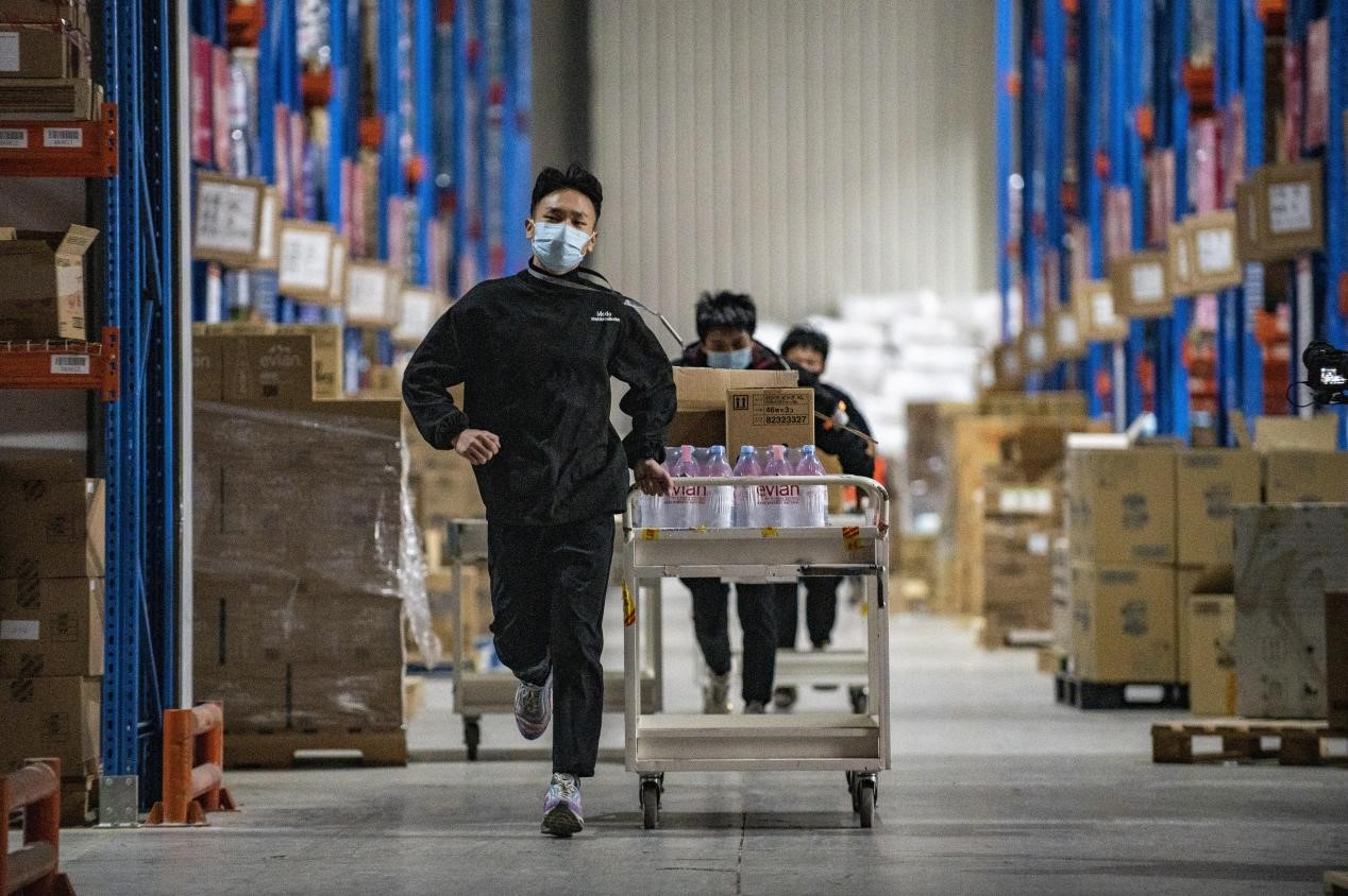 A man runs to collect parcels in a warehouse owned by Chinese e-commerce giant JD.com in Jinyi Comprehensive Bonded Zone, Jinhua, east China’s Zhejiang province, Dec. 12, 2021. (People’s Daily Online/Hu Xiaofei)