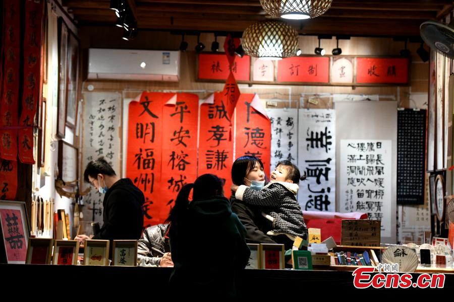 A calligraphy and painting store selling traditional couplets is seen on an ancient street in Fuzhou, capital of China’s Fujian Province, Jan. 8, 2022. (Photo: China News Service/Wang Dongming)