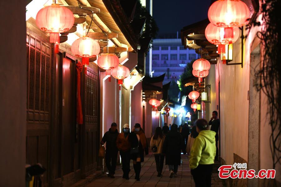 Red lanterns are hung along the blocks Three Lanes and Seven Alleys in Fuzhou, January 10, 2022. (Photo: China News Service/Wang Dongming)