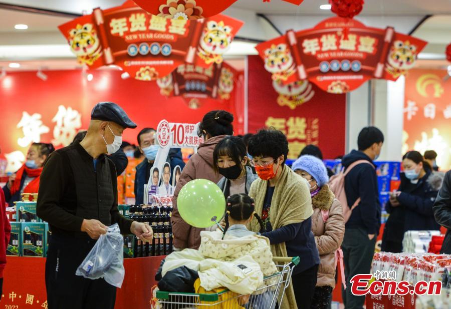 Local citizens purchase goods at the “Spring Festival Shopping area” in a mall in Urumqi, capital of northwest China’s Xinjiang Uyghur Autonomous Region on January 10, 2022. (Photo: China News Service/Liu Xin)