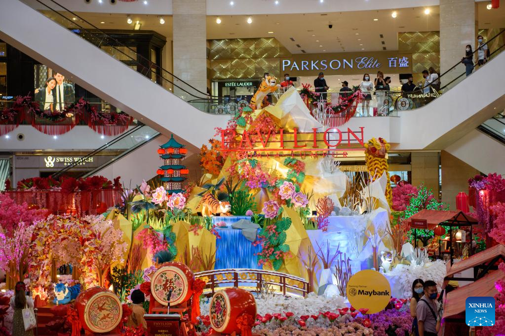 Photo taken on Jan. 11, 2022 shows a view of the Pavilion Paper Art Garden in Kuala Lumpur, Malaysia. The Pavilion Paper Art Garden, with splendid traditional Chinese art of paper cutting works, was set in celebrations of the upcoming Chinese New Year. (Photo by Chong Voon Chung/Xinhua)