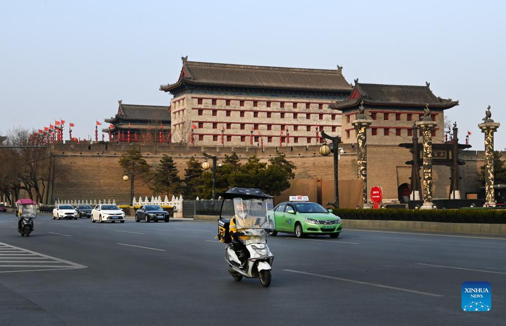 A deliveryman is seen on his way to deliver food for customers in Xi'an, capital of northwest China's Shaanxi Province, Jan. 10, 2022. Local authorities advance the orderly resumption of businesses dealing with the supply of necessities, postal and express delivery services, and the catering industry, amid the latest COVID-19 resurgence. (Xinhua/Tao Ming)