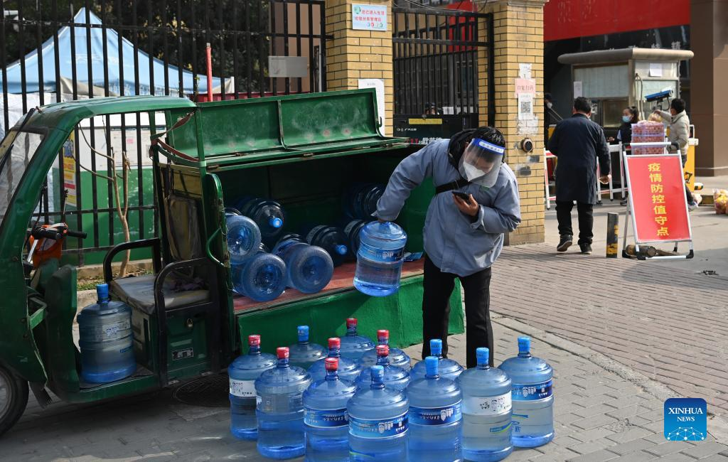 A deliveryman prepares to send water to residents at a community in Xi'an, capital of northwest China's Shaanxi Province, Jan. 10, 2022. Local authorities advance the orderly resumption of businesses dealing with the supply of necessities, postal and express delivery services, and the catering industry, amid the latest COVID-19 resurgence. (Xinhua/Tao Ming)