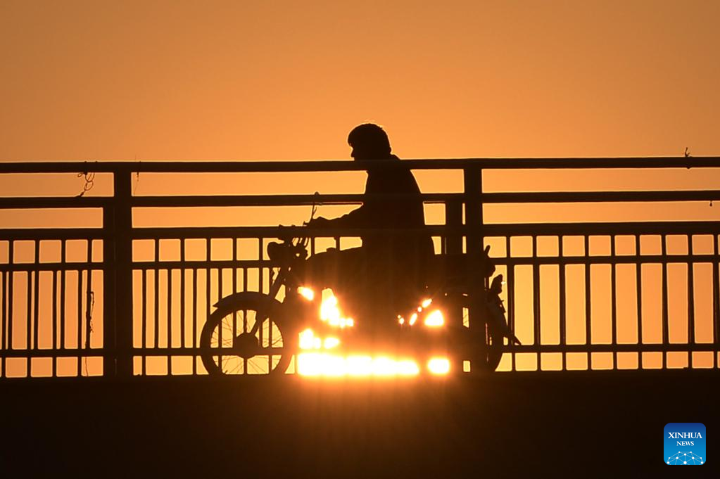 Photo taken on Jan. 11, 2022 shows the silhouette of a man riding a motorbike on a bridge during sunset in Islamabad, capital of Pakistan. (Xinhua/Ahmad Kamal)