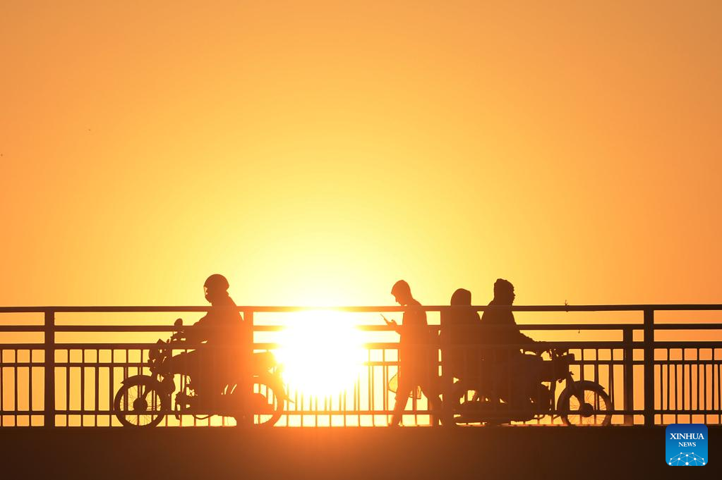Photo taken on Jan. 11, 2022 shows the silhouette of people on a bridge during sunset in Islamabad, capital of Pakistan. (Xinhua/Ahmad Kamal)