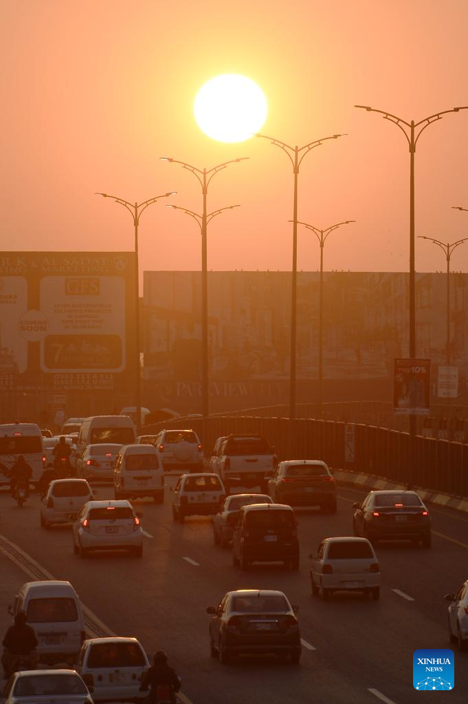 Photo taken on Jan. 11, 2022 shows vehicles moving on a highway during sunset in Islamabad, capital of Pakistan. (Xinhua/Ahmad Kamal)