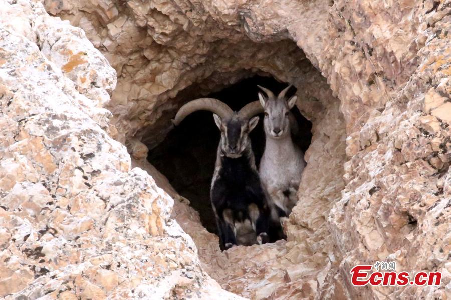 Photo shows two argali sheep at the source of the Yellow River section of the Sanjiangyuan National Park in Golog Tibetan autonomous prefecture of Northwest China's Qinghai province. (Photo: China News Service/Guo Qing)