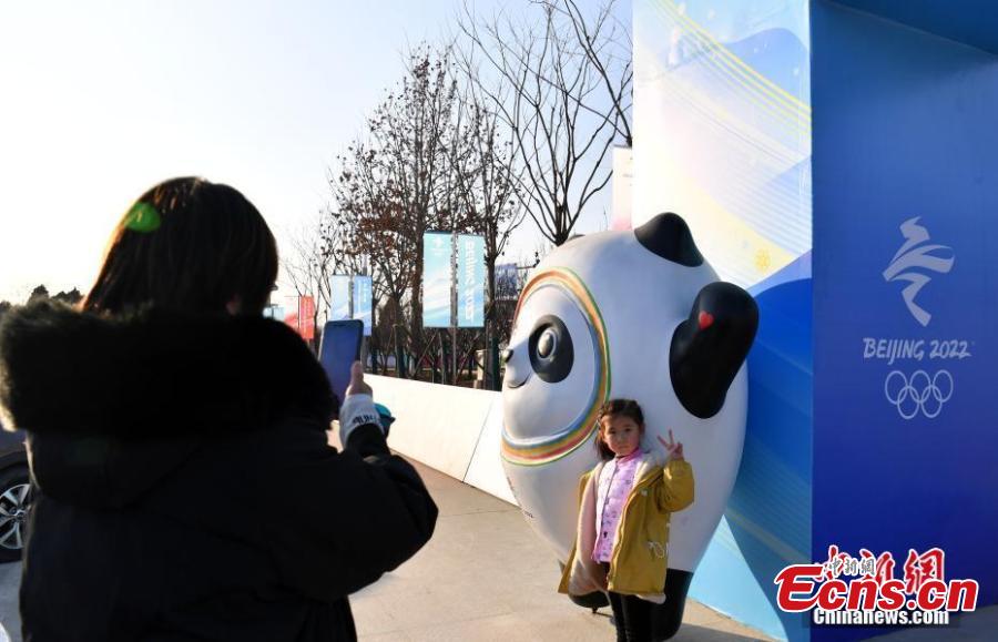 A mother takes a photo of her daughter at the Xiongan Winter Olympic Cultural Square, January 11, 2022. (Photo: China News Service/Han Bing)