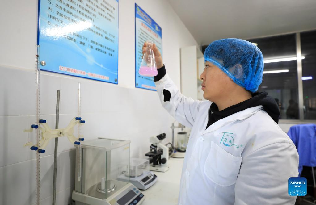 A worker tests Chinese sauerkraut products at a factory in Tanggangzi Village, Anshan City, northeast China's Liaoning Province, Jan. 10, 2022. Chinese sauerkraut is a popular dish in northeast China. Tanggangzi Village in northeast China's Liaoning Province built a village-run sauerkraut factory. The factory has created over 120 jobs for villagers and its products sell well both at home and abroad. (Xinhua/Yang Qing)