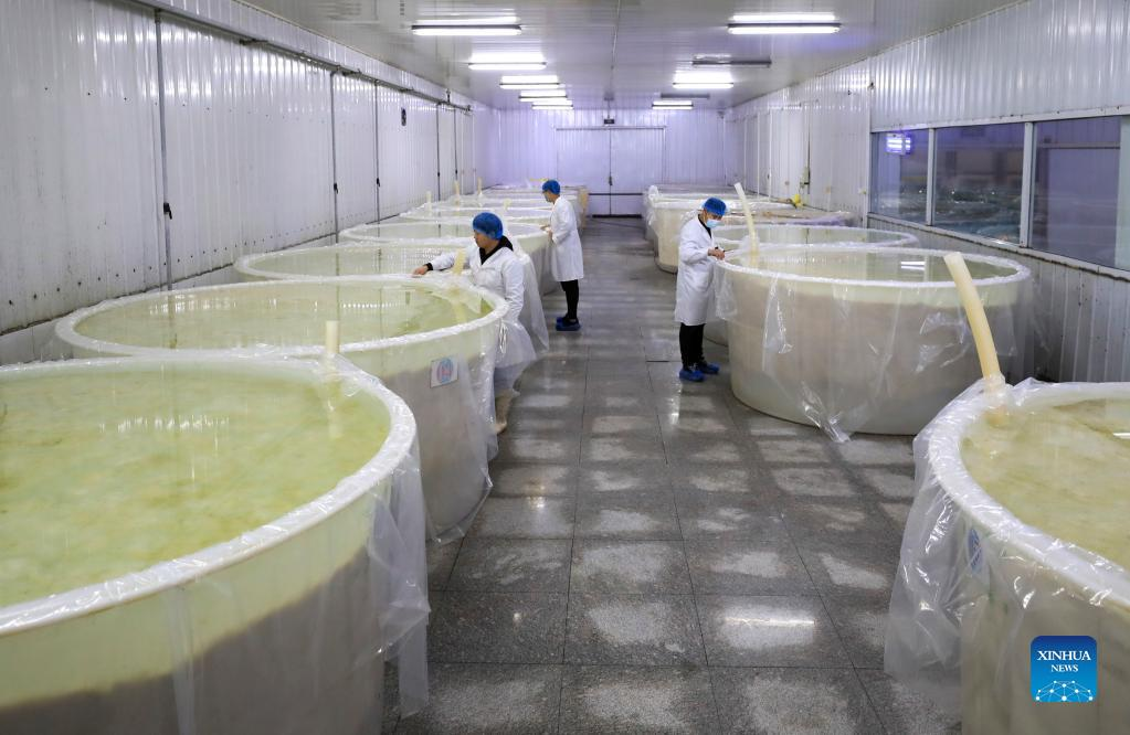 Workers check Chinese sauerkraut in fermentation at a factory in Tanggangzi Village, Anshan City, northeast China's Liaoning Province, Jan. 10, 2022. Chinese sauerkraut is a popular dish in northeast China. Tanggangzi Village in northeast China's Liaoning Province built a village-run sauerkraut factory. The factory has created over 120 jobs for villagers and its products sell well both at home and abroad. (Xinhua/Yang Qing)