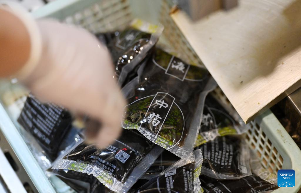 Packages of traditional Chinese medicine (TCM) decoctions are seen at the First Teaching Hospital of Tianjin University of Traditional Chinese Medicine in north China's Tianjin, Jan. 12, 2022. TCM has been widely applied in the COVID-19 prevention and control in Tianjin, improving the immune capacity of individuals under medical quarantine. (Xinhua/Li Ran)