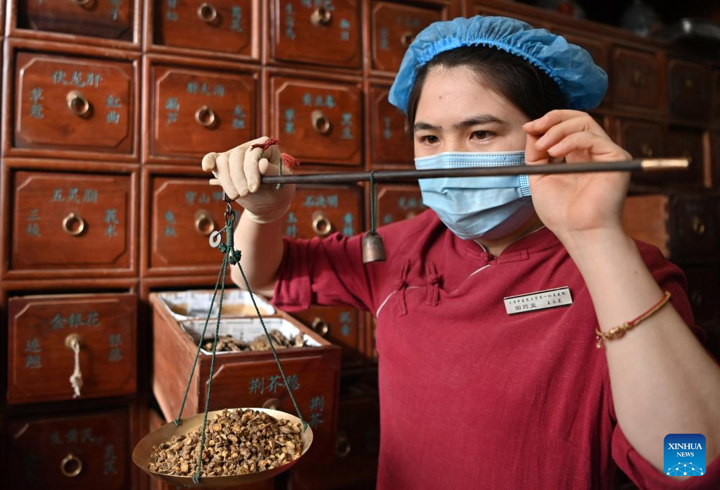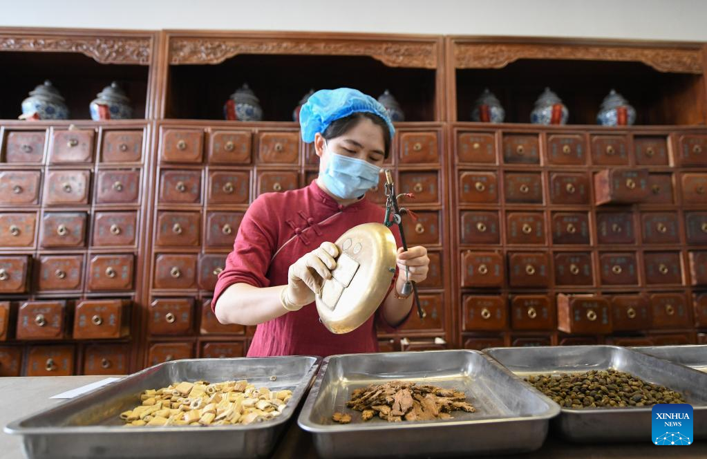 A pharmacist weighs ingredients to produce traditional Chinese medicine (TCM) decoctions at the First Teaching Hospital of Tianjin University of Traditional Chinese Medicine in north China's Tianjin, Jan. 12, 2022. TCM has been widely applied in the COVID-19 prevention and control in Tianjin, improving the immune capacity of individuals under medical quarantine. (Xinhua/Li Ran)