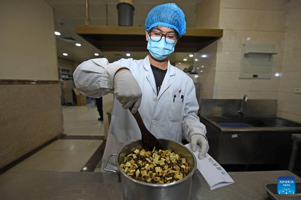 A pharmacist prepares ingredients to produce traditional Chinese medicine (TCM) decoctions at the First Teaching Hospital of Tianjin University of Traditional Chinese Medicine in north China's Tianjin, Jan. 12, 2022. TCM has been widely applied in the COVID-19 prevention and control in Tianjin, improving the immune capacity of individuals under medical quarantine. (Xinhua/Li Ran)