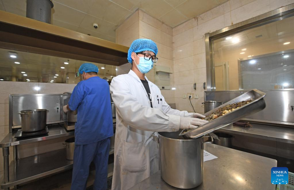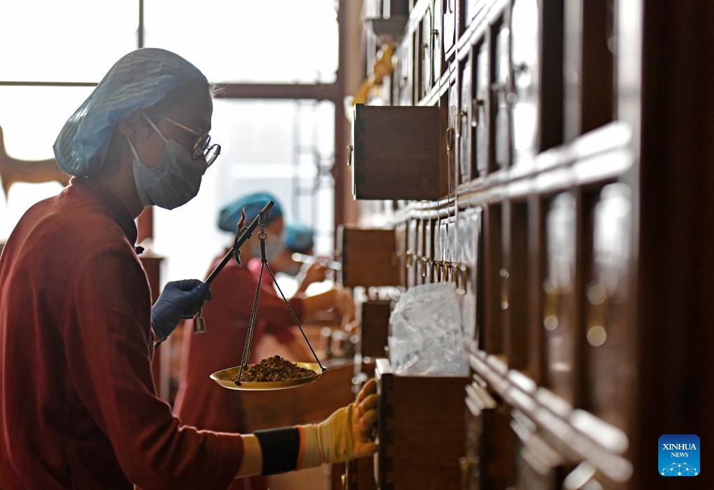 A pharmacist prepares ingredients to produce traditional Chinese medicine (TCM) decoctions at the First Teaching Hospital of Tianjin University of Traditional Chinese Medicine in north China's Tianjin, Jan. 12, 2022. TCM has been widely applied in the COVID-19 prevention and control in Tianjin, improving the immune capacity of individuals under medical quarantine. (Xinhua/Zhao Zishuo)