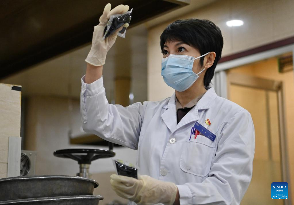 A pharmacist examines packages of traditional Chinese medicine (TCM) decoctions at the First Teaching Hospital of Tianjin University of Traditional Chinese Medicine in north China's Tianjin, Jan. 12, 2022. TCM has been widely applied in the COVID-19 prevention and control in Tianjin, improving the immune capacity of individuals under medical quarantine. (Xinhua/Li Ran)