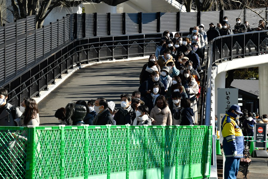 Visitors wait in line to see giant panda cubs at Ueno zoo in Tokyo, Japan, Jan. 12, 2022. (Xinhua/Zhang Xiaoyu)