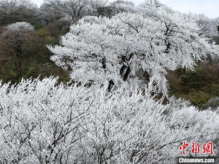 Photo taken on January 11, 2022 shows that rime appears on the upper part of a mountain in Guangxi Zhuang Autonomous Region, while the lower part remains emerald. (Photo: China News Service/Liang Qiang)