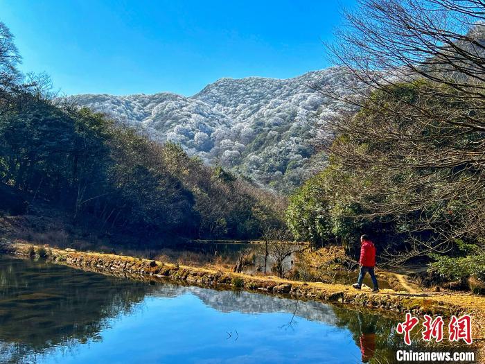 A man passes by a lake surrounded by rime-covered trees in a mountain, January 11, 2022. (Photo: China News Service/Liang Qiang)