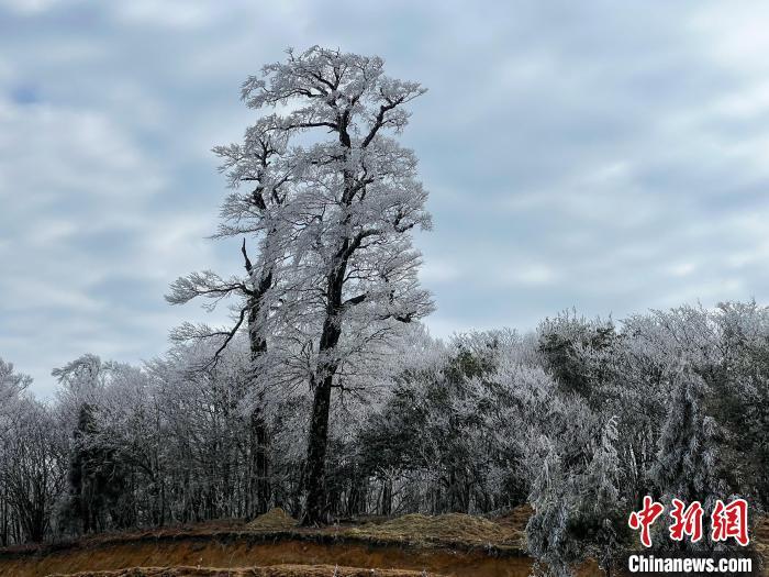 Photo taken on January 11, 2022 shows that rime appears on the upper part of a mountain in Guangxi Zhuang Autonomous Region, while the lower part remains emerald. (Photo: China News Service/Liang Qiang)