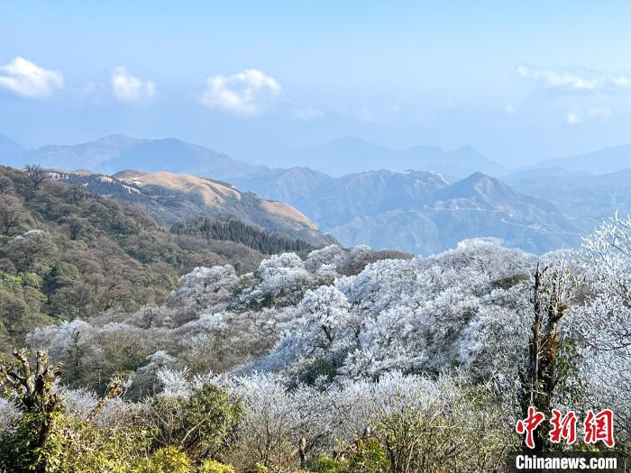 Photo taken on January 11, 2022 shows that rime appears on the upper part of a mountain in Guangxi Zhuang Autonomous Region, while the lower part remains emerald. (Photo: China News Service/Liang Qiang)